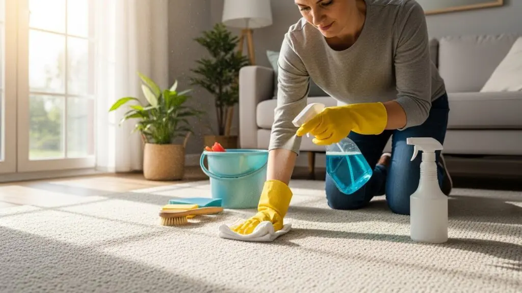 A: Use mild detergent, rinse thoroughly, choose carpet‑safe disinfectants, and ventilate well.